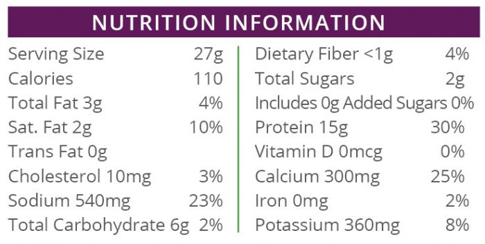 Ingredients: Calcium Caseinate, Parmesan and Cheddar Cheeses [(Cultured Pasteurized Milk and Part-Skim Milk, Salt, Enzymes, Cheese Cultures), Whey, Buttermilk Solids, Salt, Disodium Phosphate, Lactic Acid], Milk Protein Isolate, Modified Corn Starch, Natural Cheese Flavor, Gum Blend (Acacia, Guar, Xanthan), Garlic Powder, Potassium Citrate, Citric Acid, Salt, Annatto Powder (for color), Turmeric Powder (For color), Soy Lecithin, Sunflower Lecithin.