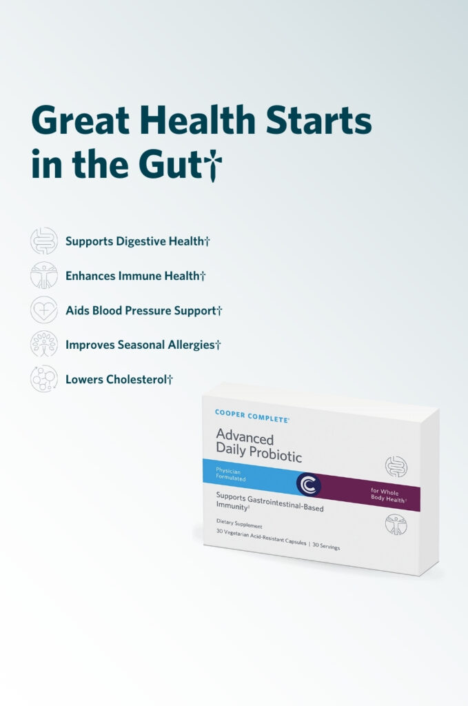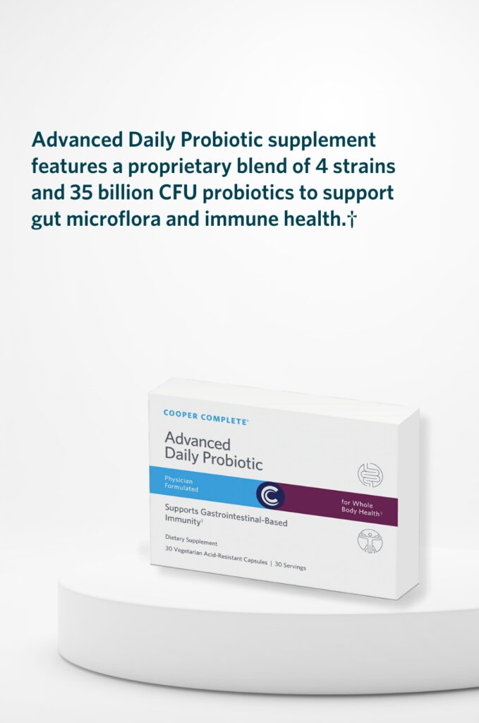 Promote digestive balance, immune health, and overall wellness with Cooper Complete® Advanced Daily Probiotic — 35 billion CFU from 4 strains plus Saccharomyces boulardii. Gluten-free, vegetarian capsules. 30 per box.